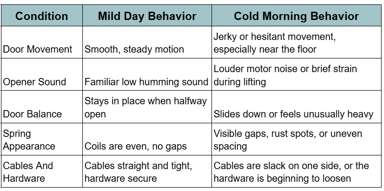 Use this table to compare how your garage door behaves on a mild day versus a chilly morning: