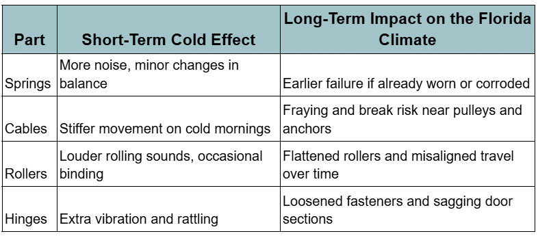 Repeated cooler spells cause metal parts to contract, highlighting existing wear. Over time, springs, cables, and rollers can degrade more quickly, especially when combined with heavy daily use and Florida’s humidity.