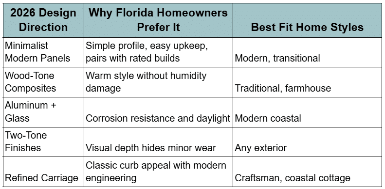 Once Florida performance needs are met, homeowners select styles that complement architecture and neighborhood tone. These are the strongest 2026 directions.